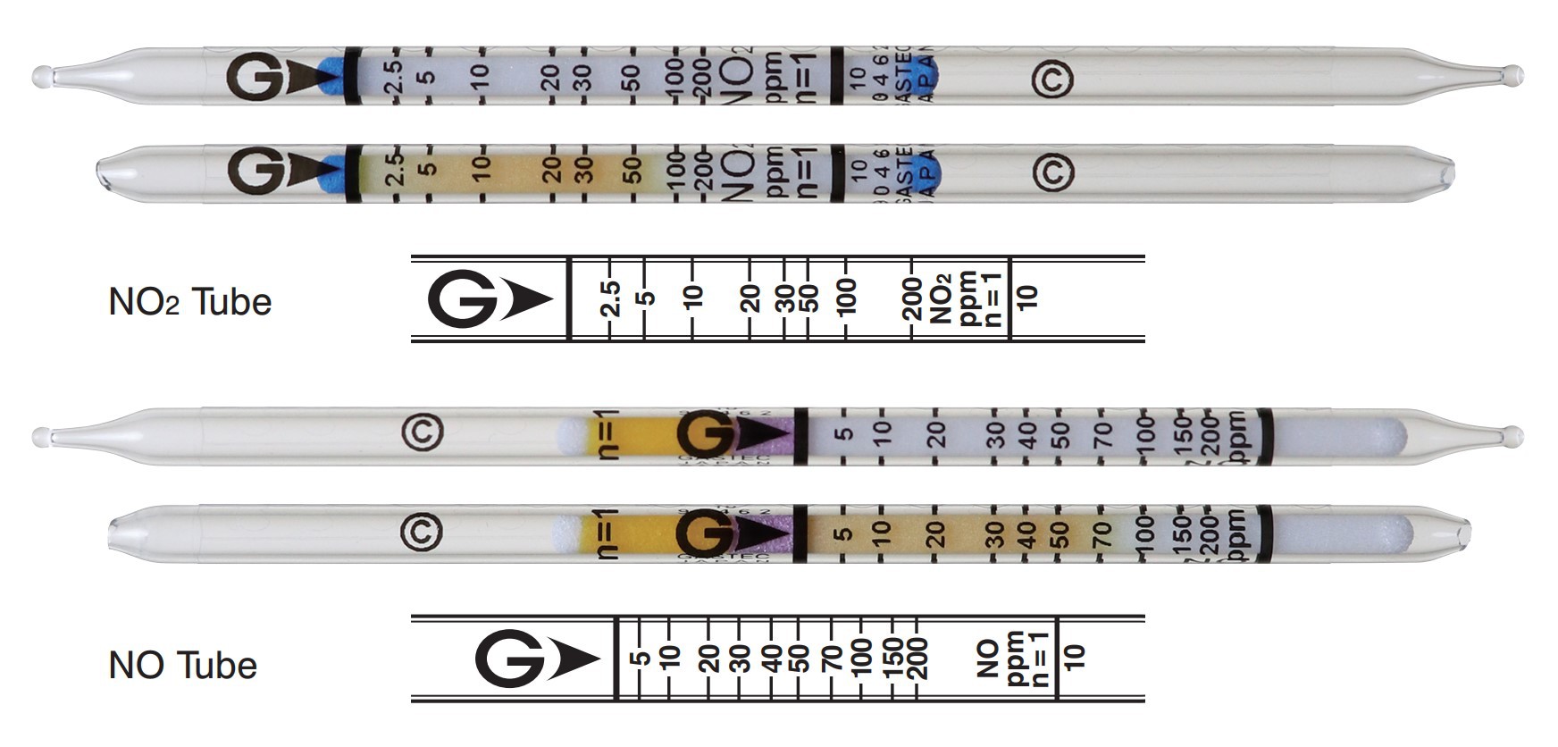 氮氧化物检测管是一根密封的细长玻璃管,因为填充有特定的试剂和着色剂而呈现特定的颜色,当含有氮氧化物的气体样品进入检测管后,会发生化学变化,从而引起颜色的变化。观察颜色变化的界限对应的刻度,即是被测样品中的氮氧化物的浓度。
